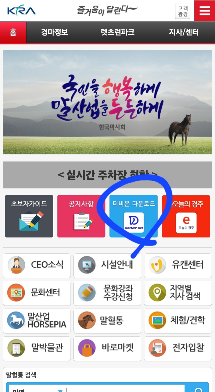 - 한국마사회 공식 홈페이지 접속(반드시 스마트폰으로 접속, 더비온 다운로드)